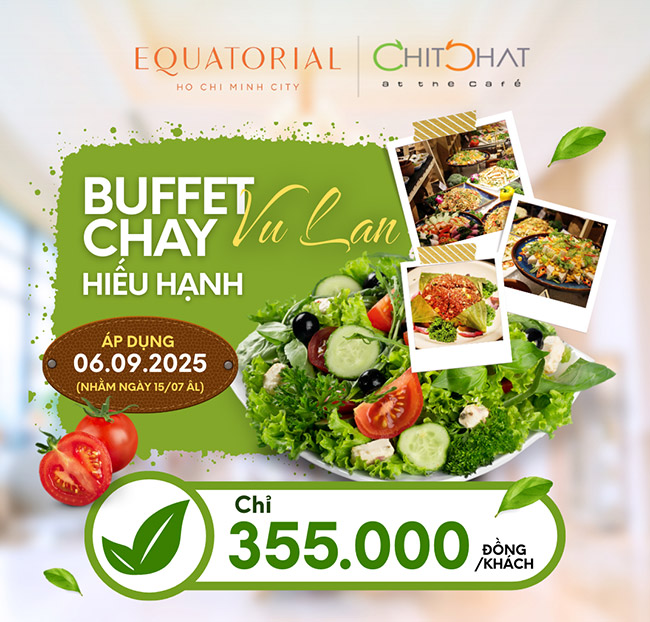 – Buffet chay mùa Vu Lan được tổ chức từ 18:00 – 22:00 duy nhất thứ 7 ngày 06/09/2025 (nhằm ngày 15/07 âm lịch) tại Nhà hàng Chit Chat at the Café thuộc Khách sạn 5 sao Equatorial.