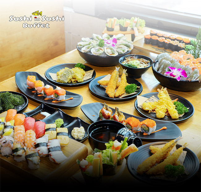 – Thực đơn buffet gồm các loại sushi nổi tiếng như Nigiri, Gunkan, Maki. Ngoài sushi, thực đơn buffet còn có các loại sashimi từ hàu, tôm; món ăn kèm hấp dẫn như gà chiên, mực chiên xù, tôm chiên giòn, cá trứng, thịt thăn chiên; salad, súp, mì, rau trộn, tráng miệng…